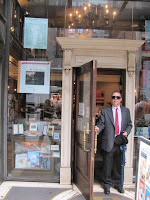 A mafia don? No! The author, seen in deep disguise, wearing a tie. The poster in the window shows the cover of Quiet Corners of Rome.