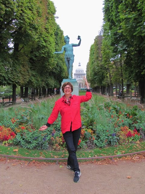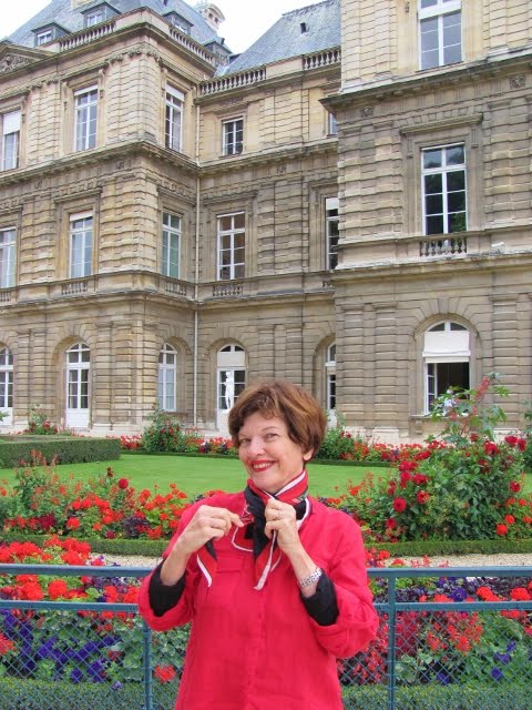 Fun in the sun (and rain) department: spend a spell with yours truly and author and fellow Paris card — Harriet is known for her contagious laughter and irreverent sense of humor — Harriet Welty Rochefort tooling around the Luxembourg Garden and surrounding streets. We share insights, jokes, tips on Franco-American cultural differences, plus places to have coffee, eat, drink, be merry, read poetry off walls (not off the wall poetry, editor’s note)… All this for free, naturally, on the indispensable Paris website Bonjour Paris… Here’s the lede and a link, plus some photos I snapped of Harriet just for fun…